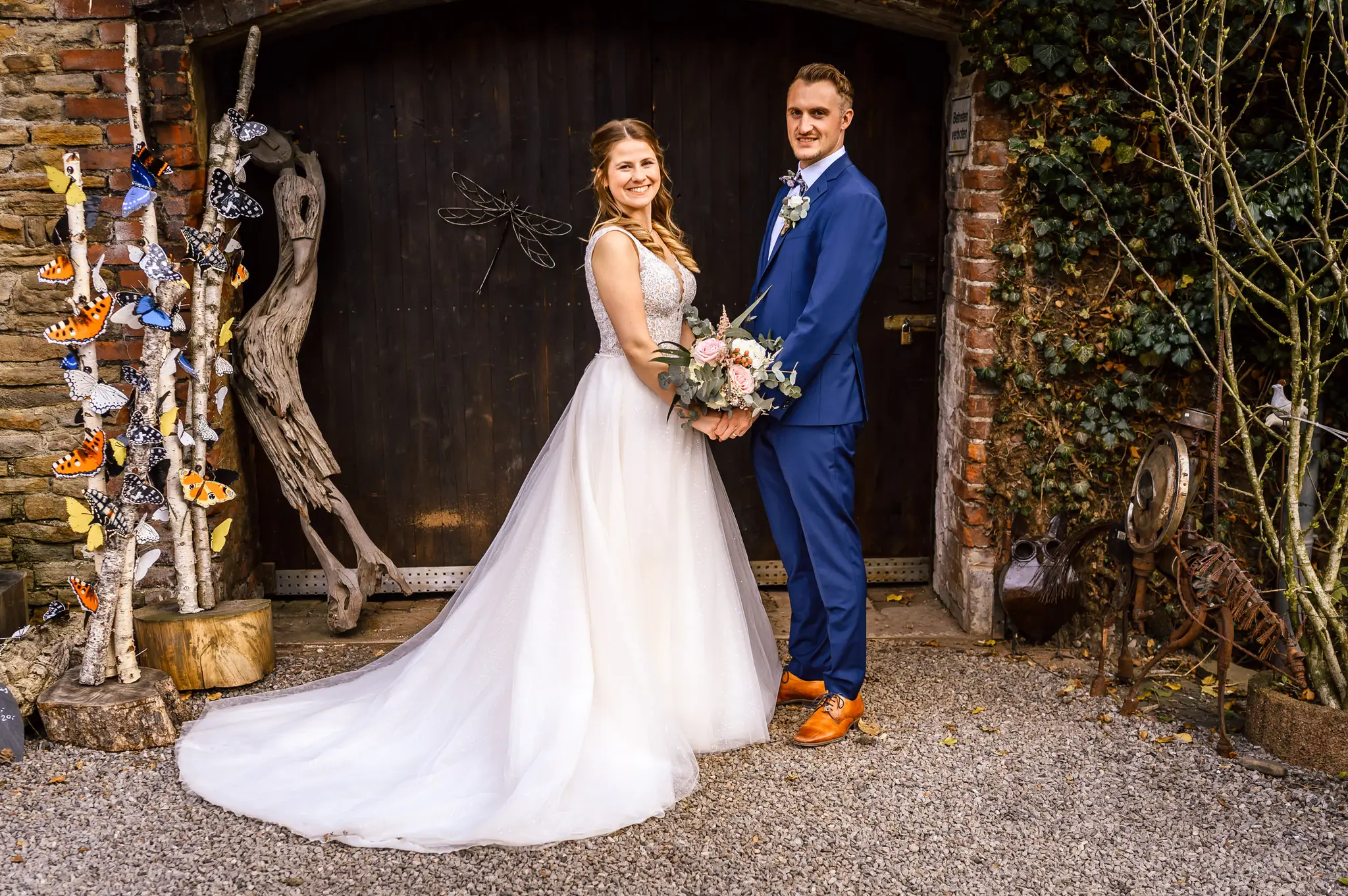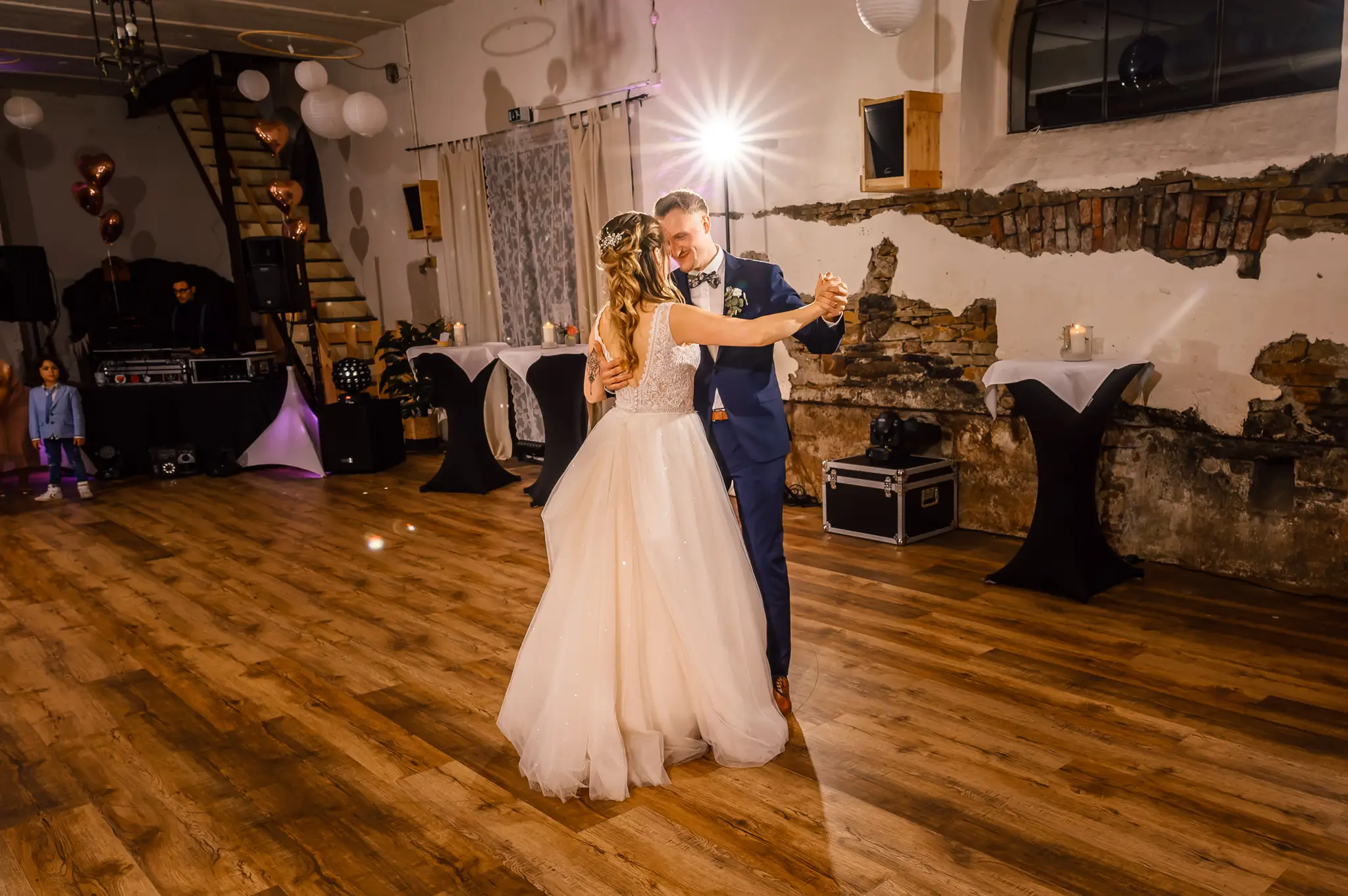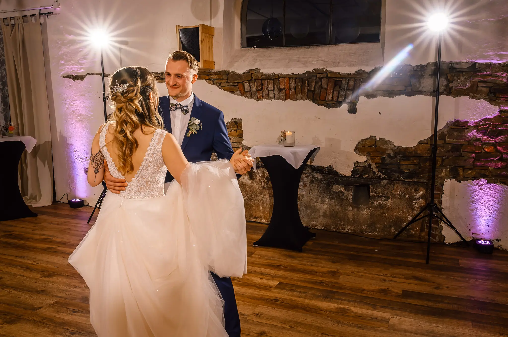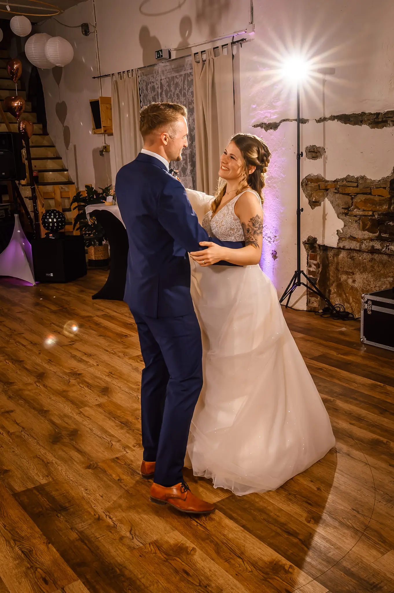 Die anschließende Feier fand dann im „Kuhstall“ auf Schloss Steinhausen in Witten statt. Die Kühe sind hier schon lange ausgezogen und so fanden alle Gäste an den schön geschmückten Tischen ausreichend Platz. Im kleinen Schlosspark erfolge dann auch die Foto-Session mit dem Brautpaar. Gefeiert wurde bis weit nach Mitternacht und so wurde aus der Hochzeit noch ein „Tanz in den Mai“.