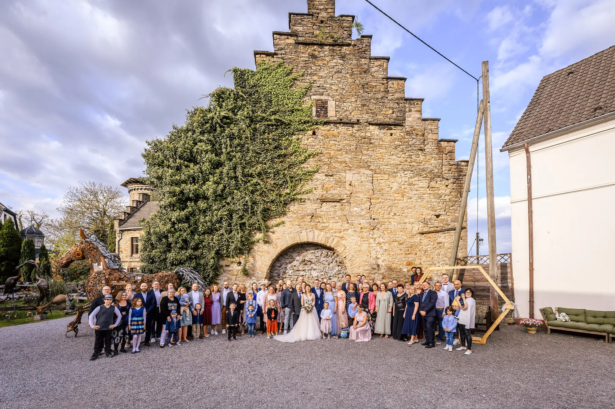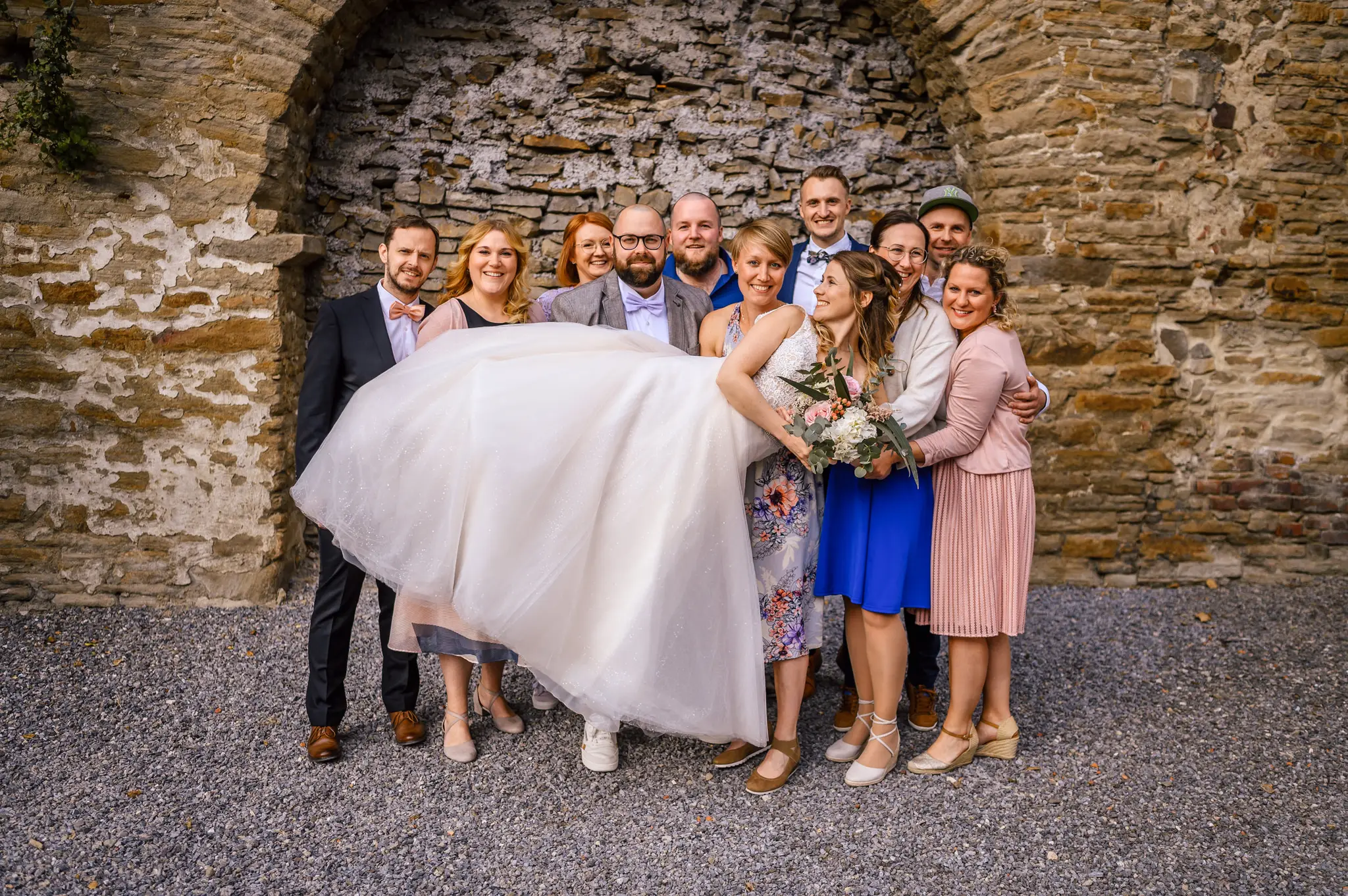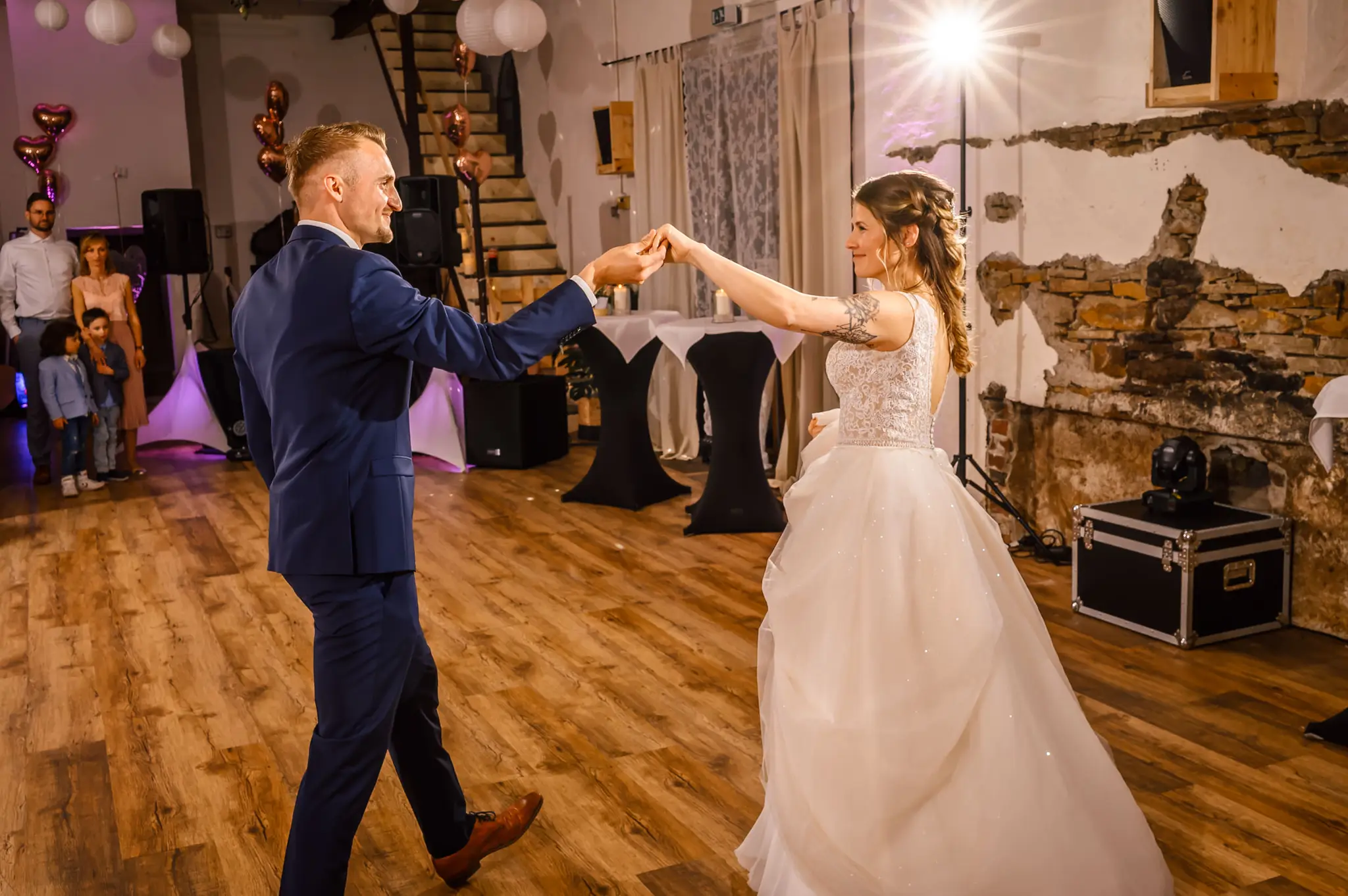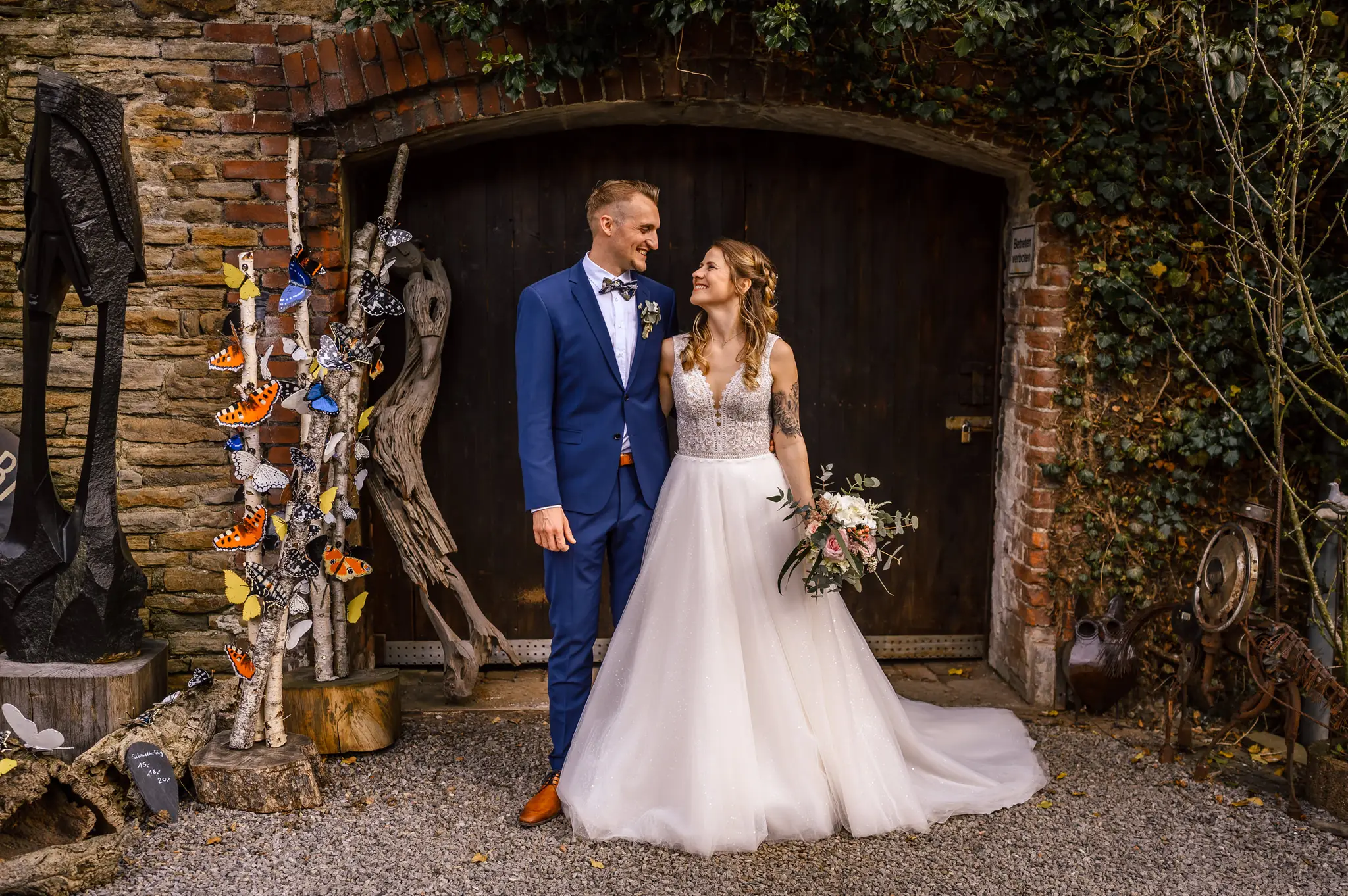 Die anschließende Feier fand dann im „Kuhstall“ auf Schloss Steinhausen in Witten statt. Die Kühe sind hier schon lange ausgezogen und so fanden alle Gäste an den schön geschmückten Tischen ausreichend Platz. Im kleinen Schlosspark erfolge dann auch die Foto-Session mit dem Brautpaar. Gefeiert wurde bis weit nach Mitternacht und so wurde aus der Hochzeit noch ein „Tanz in den Mai“.
