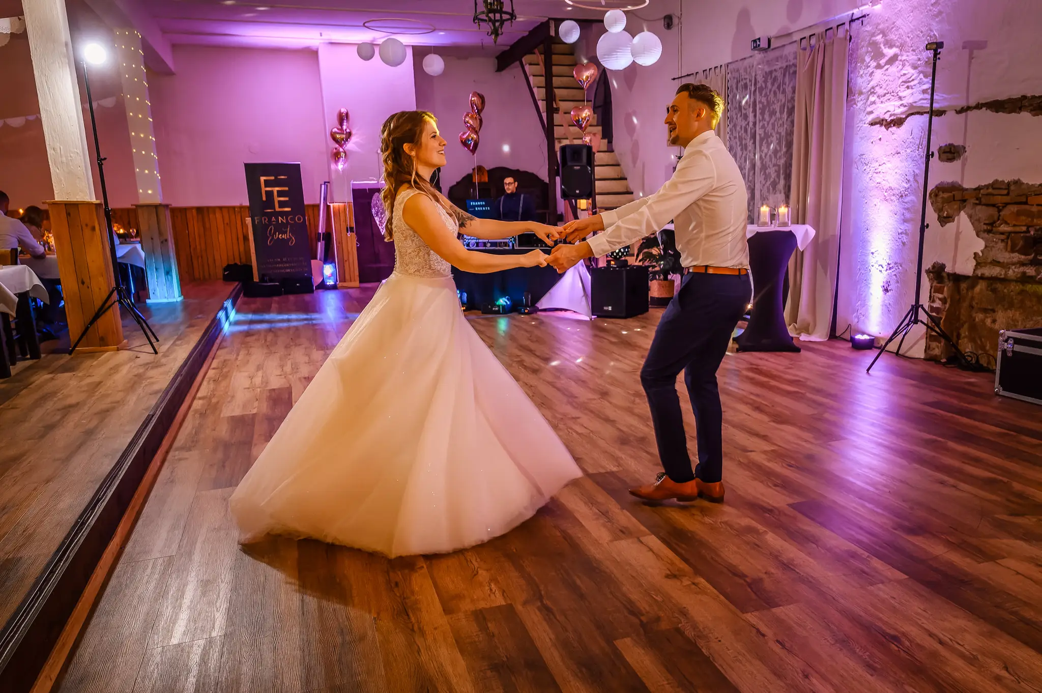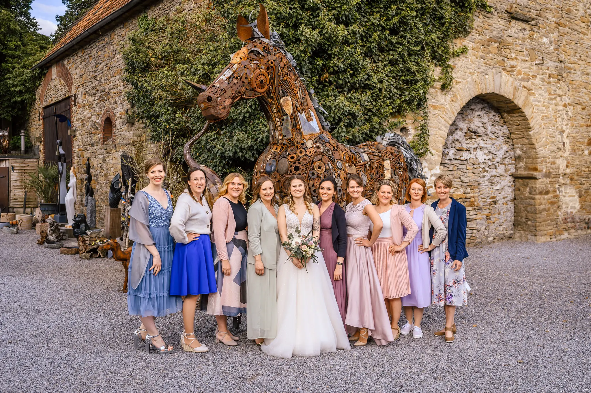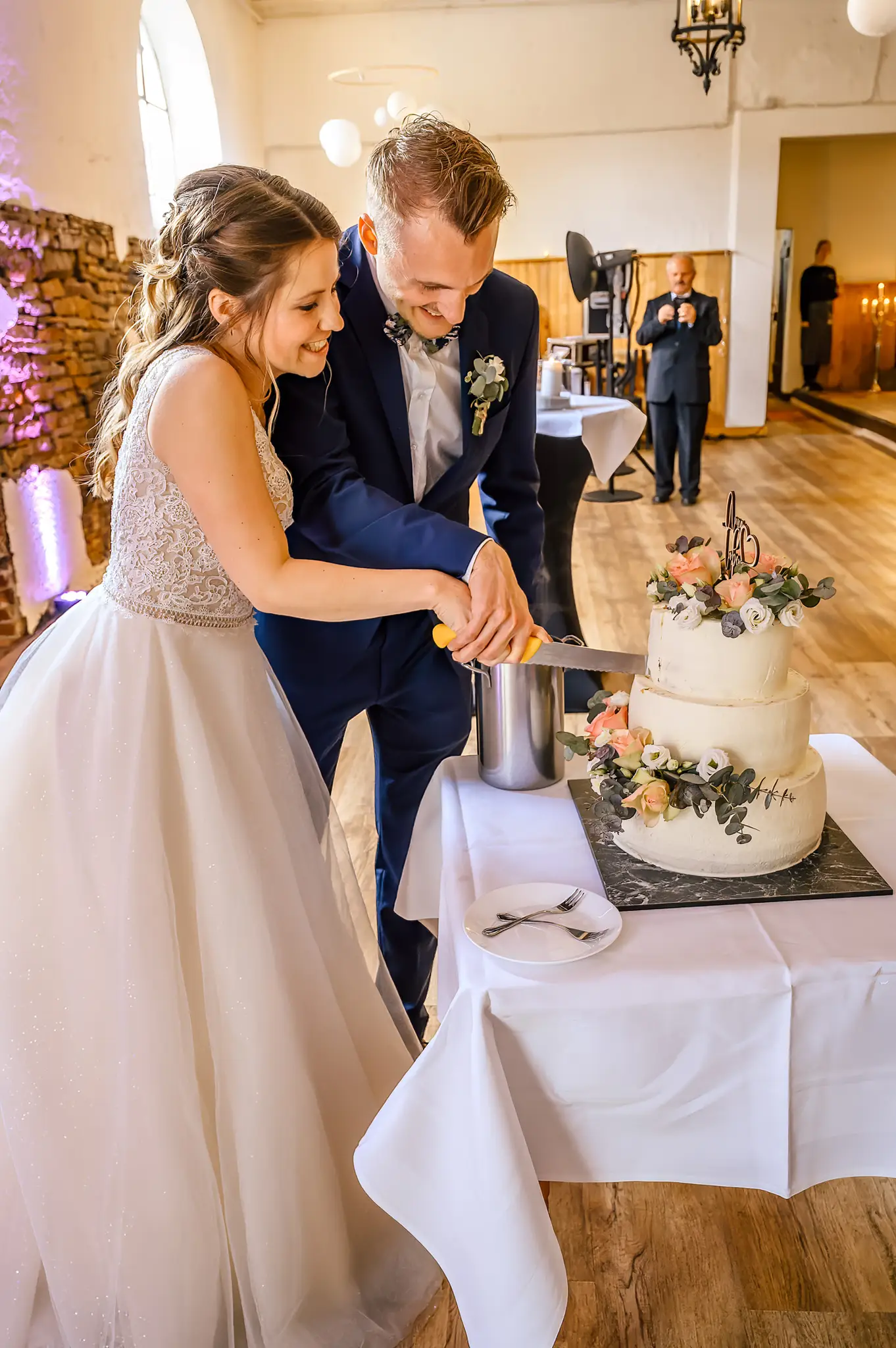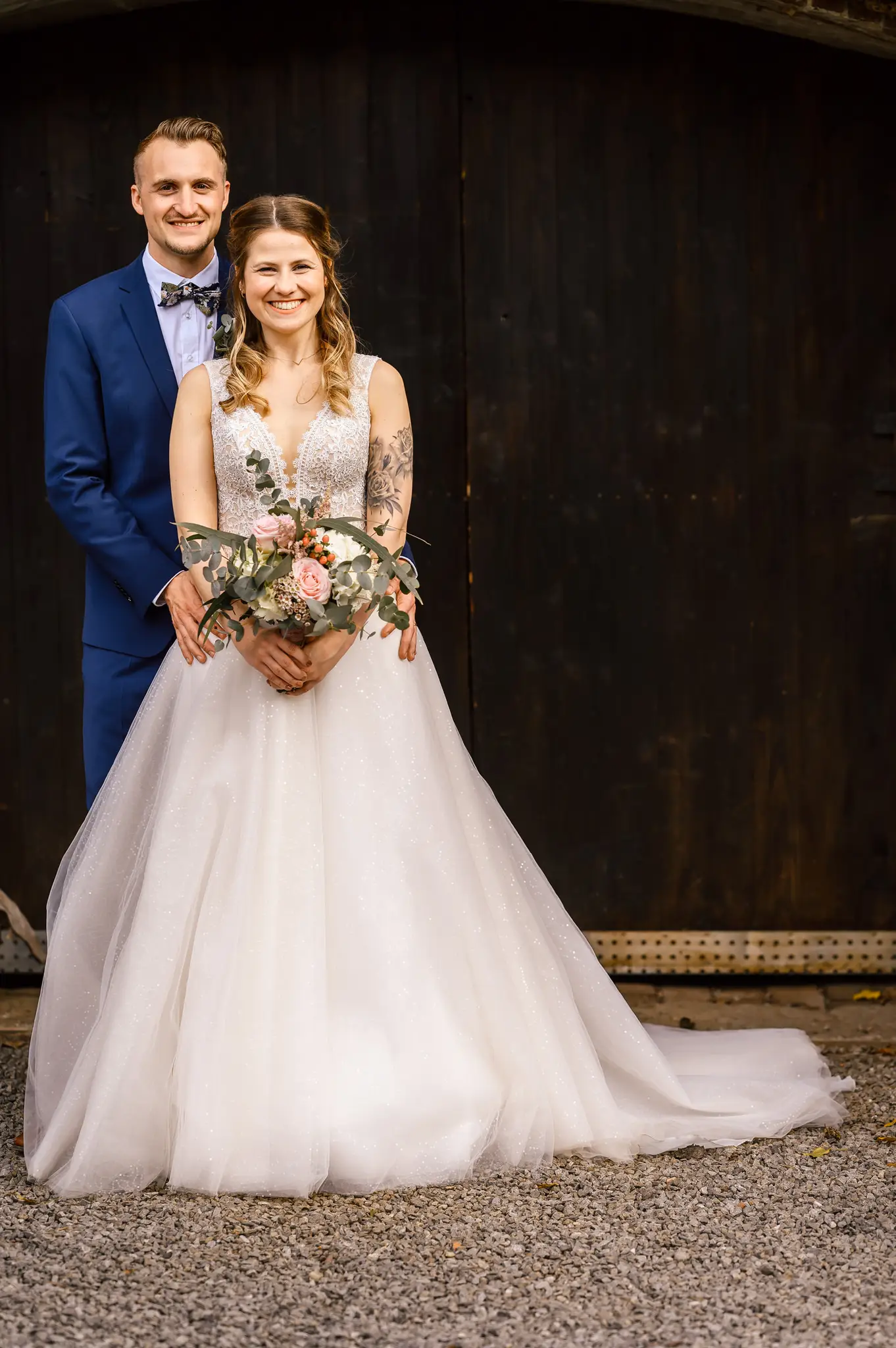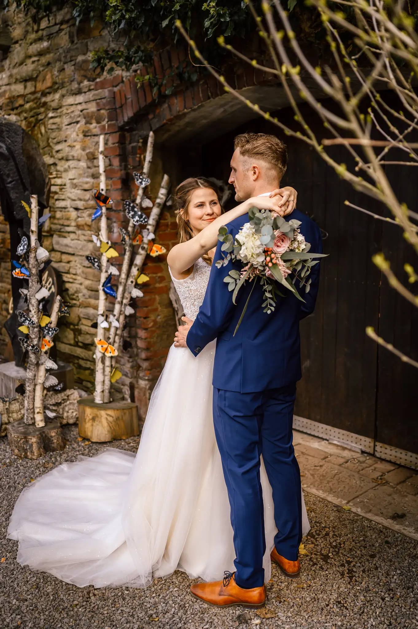 Die anschließende Feier fand dann im „Kuhstall“ auf Schloss Steinhausen in Witten statt. Die Kühe sind hier schon lange ausgezogen und so fanden alle Gäste an den schön geschmückten Tischen ausreichend Platz. Im kleinen Schlosspark erfolge dann auch die Foto-Session mit dem Brautpaar. Gefeiert wurde bis weit nach Mitternacht und so wurde aus der Hochzeit noch ein „Tanz in den Mai“.