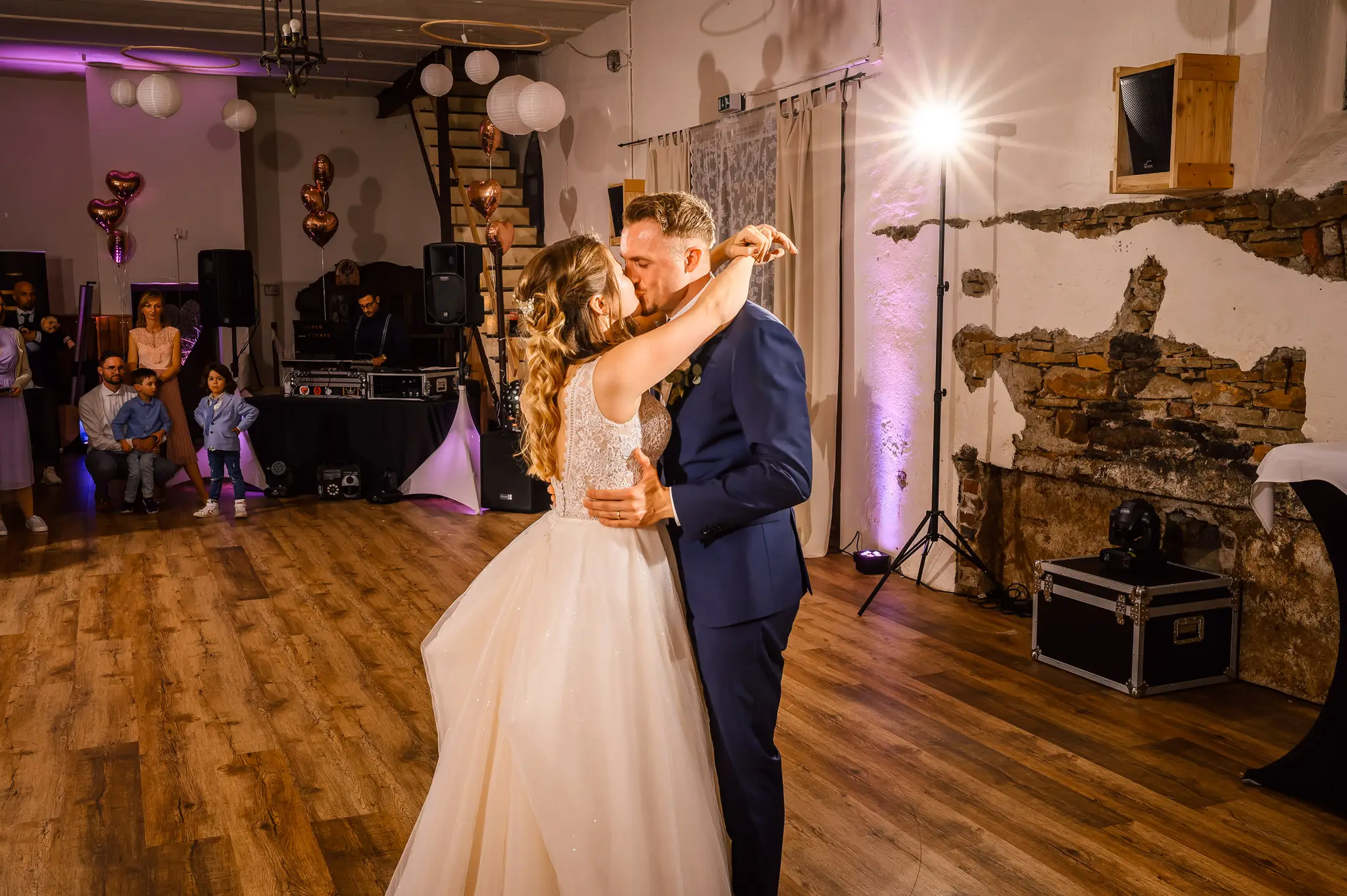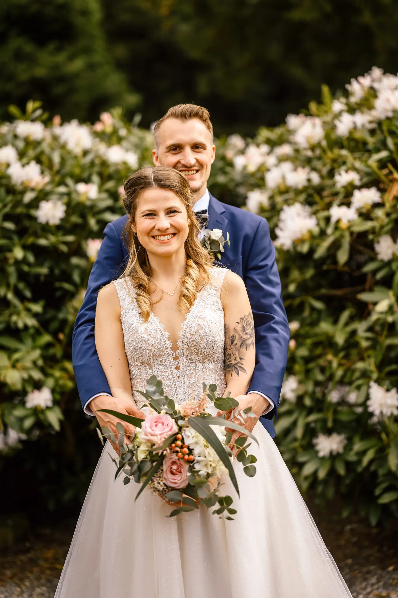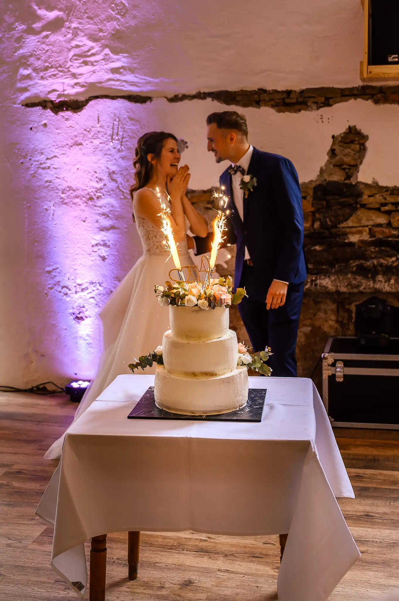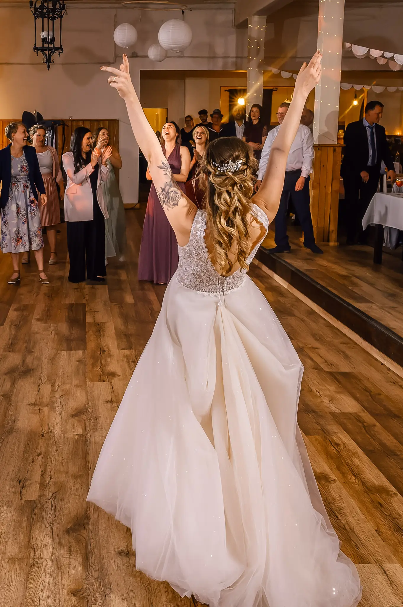 Die anschließende Feier fand dann im „Kuhstall“ auf Schloss Steinhausen in Witten statt. Die Kühe sind hier schon lange ausgezogen und so fanden alle Gäste an den schön geschmückten Tischen ausreichend Platz. Im kleinen Schlosspark erfolge dann auch die Foto-Session mit dem Brautpaar. Gefeiert wurde bis weit nach Mitternacht und so wurde aus der Hochzeit noch ein „Tanz in den Mai“.