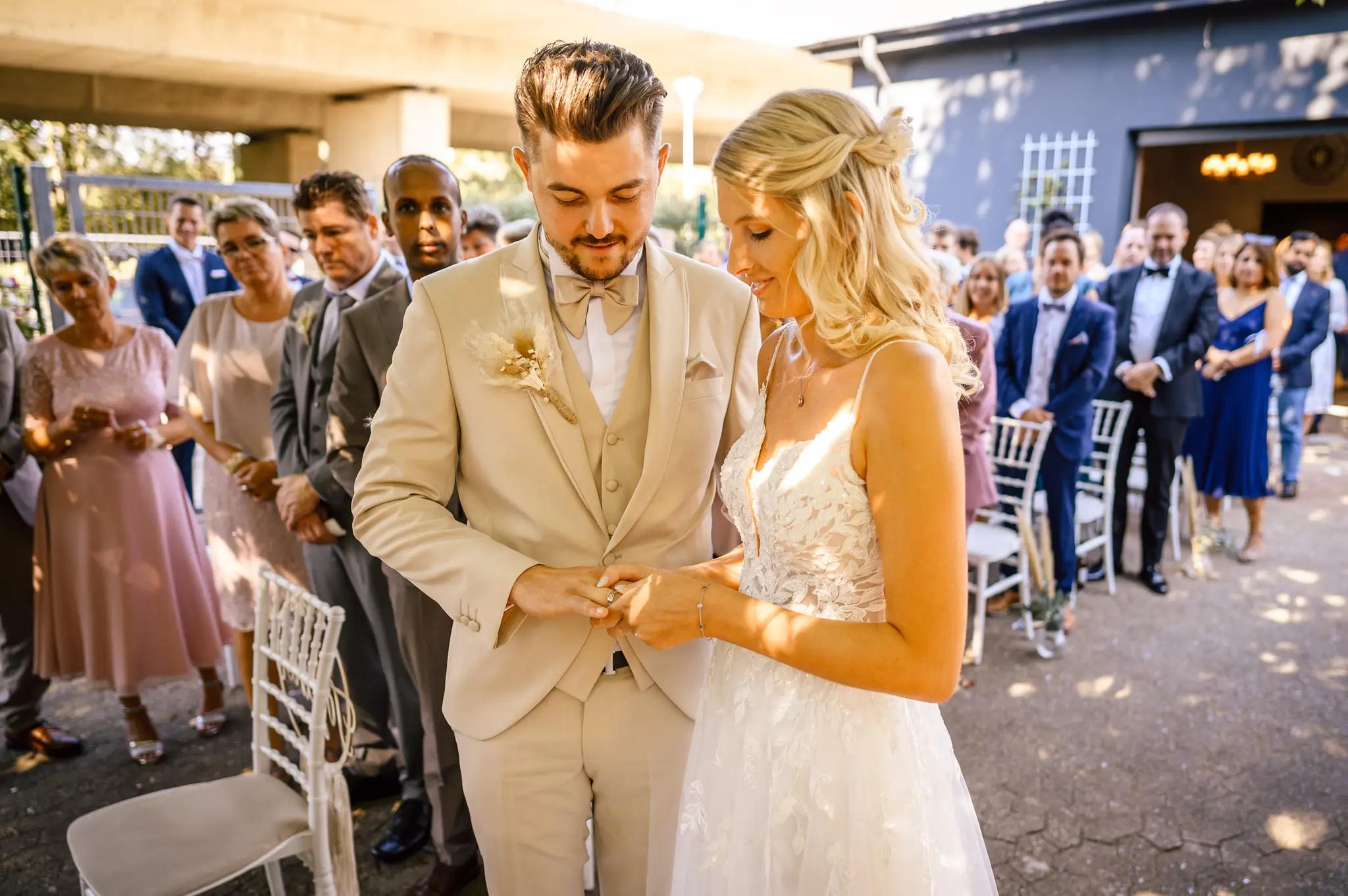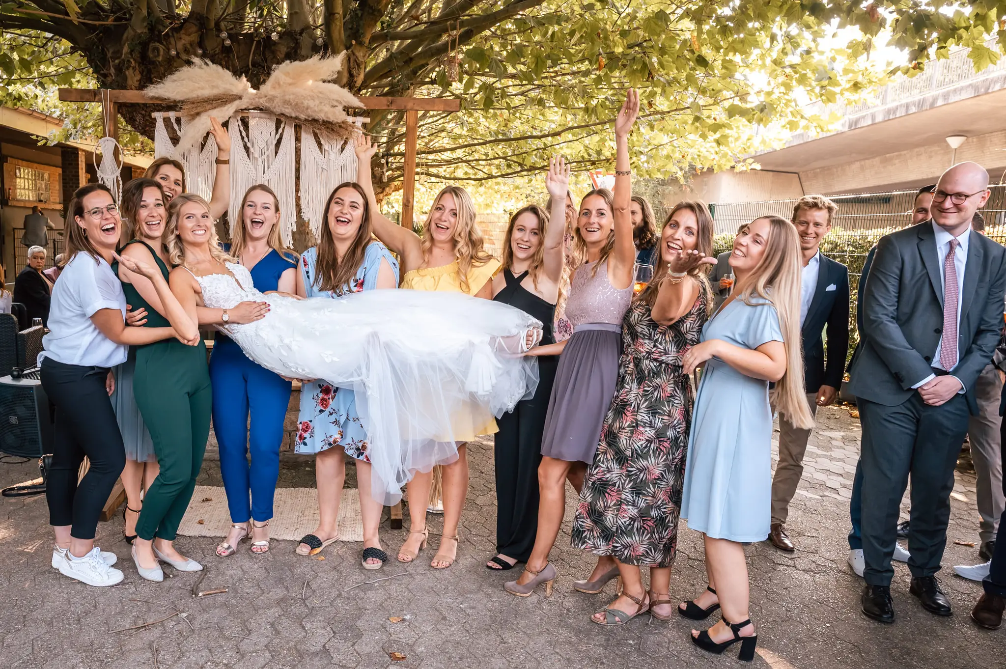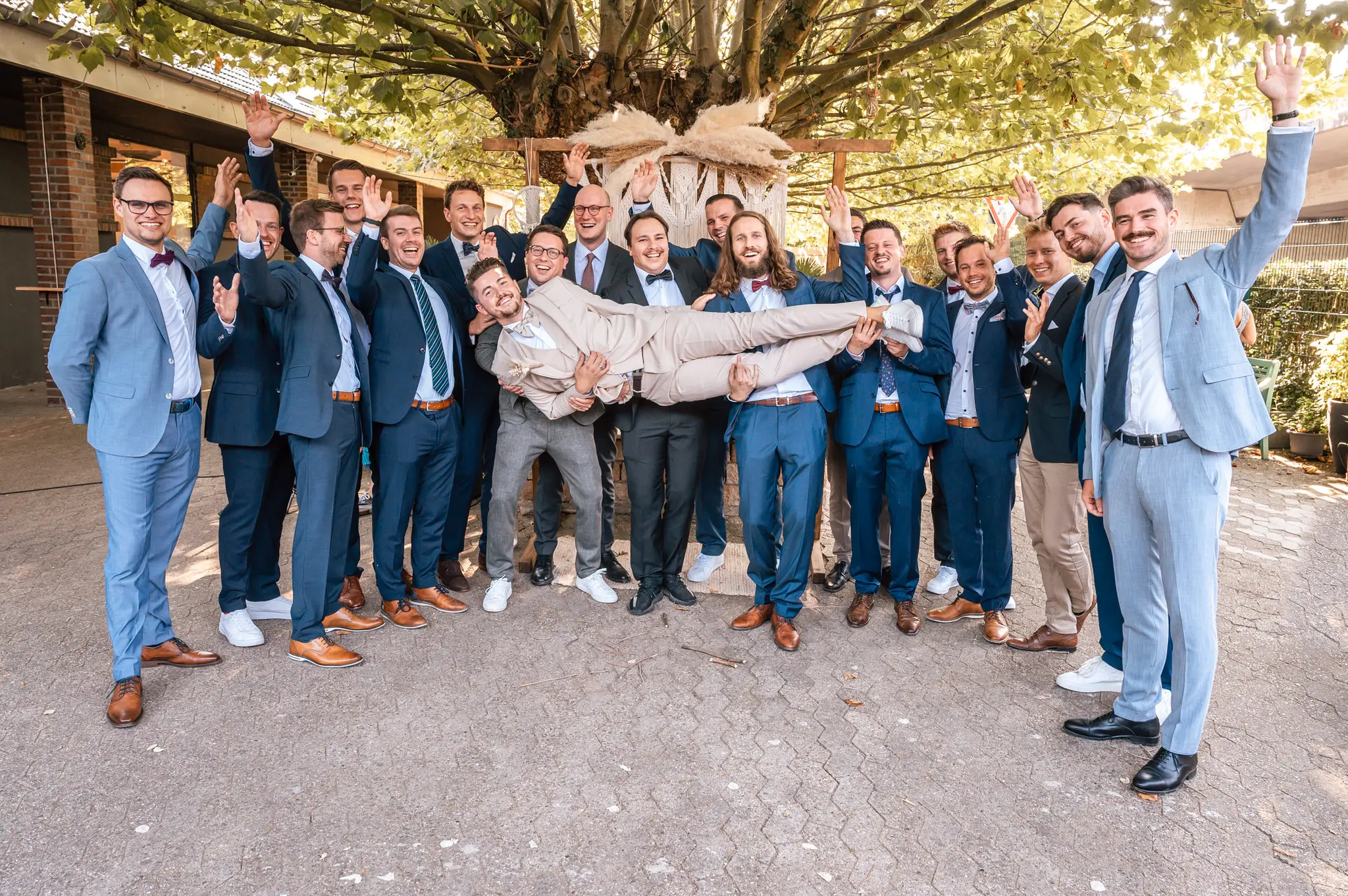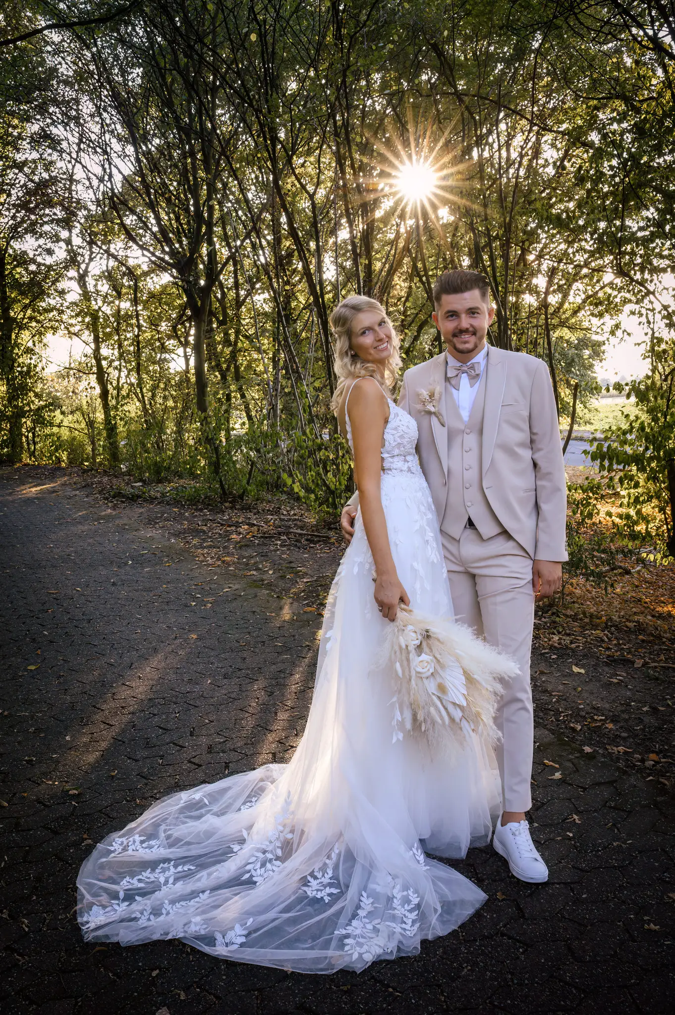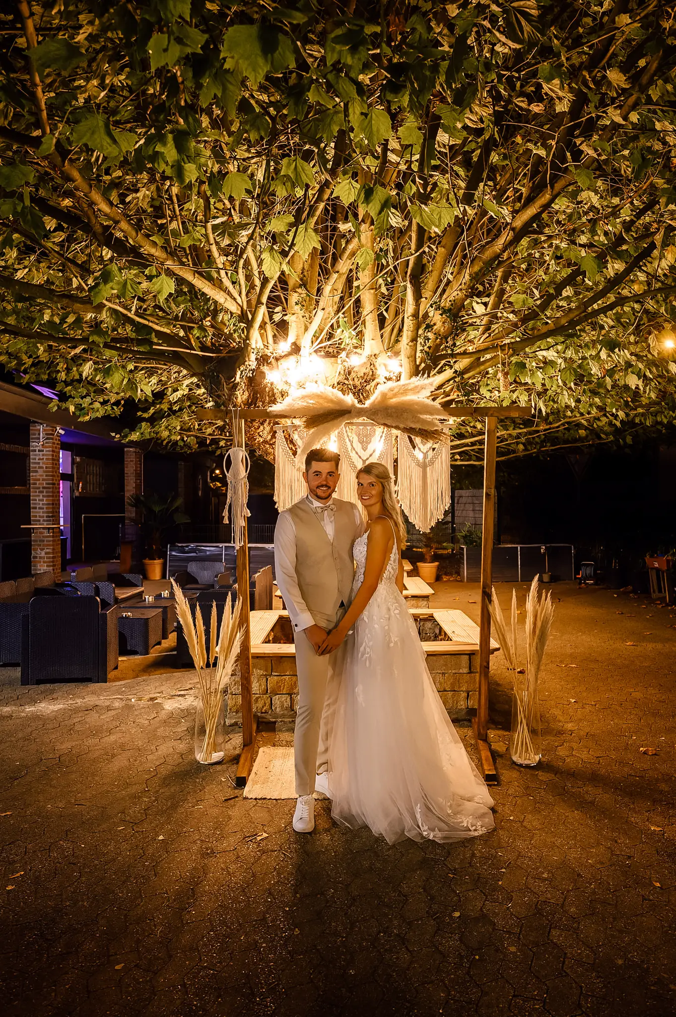 Laura und Daniel hatten sich für eine freie Trauung im Boho Stil entschieden. Während sich Daniel im Kreise seiner Freunde zu Hause fertig machte, dann das Getting Ready bei einer der Brautjungfern statt. Die freie Trauung fand dann unter einem großen Baum in der  Eventlocation „Stahlhaus“ in Krefeld statt. Die Braut wurde in einem wunderschönen Oldtimer zur Location gefahren und von ihrem Vater zum Ort der Trauung begleitet. Später machten wir dann in der Umgebung und natürlich auch mit dem Oldtimer ein kleines Brautpaar Shooting. Im Stahlhaus zurück und nach dem Essen, begann der Abend mit dem Brauttanz gefolgt von einer langen Party.